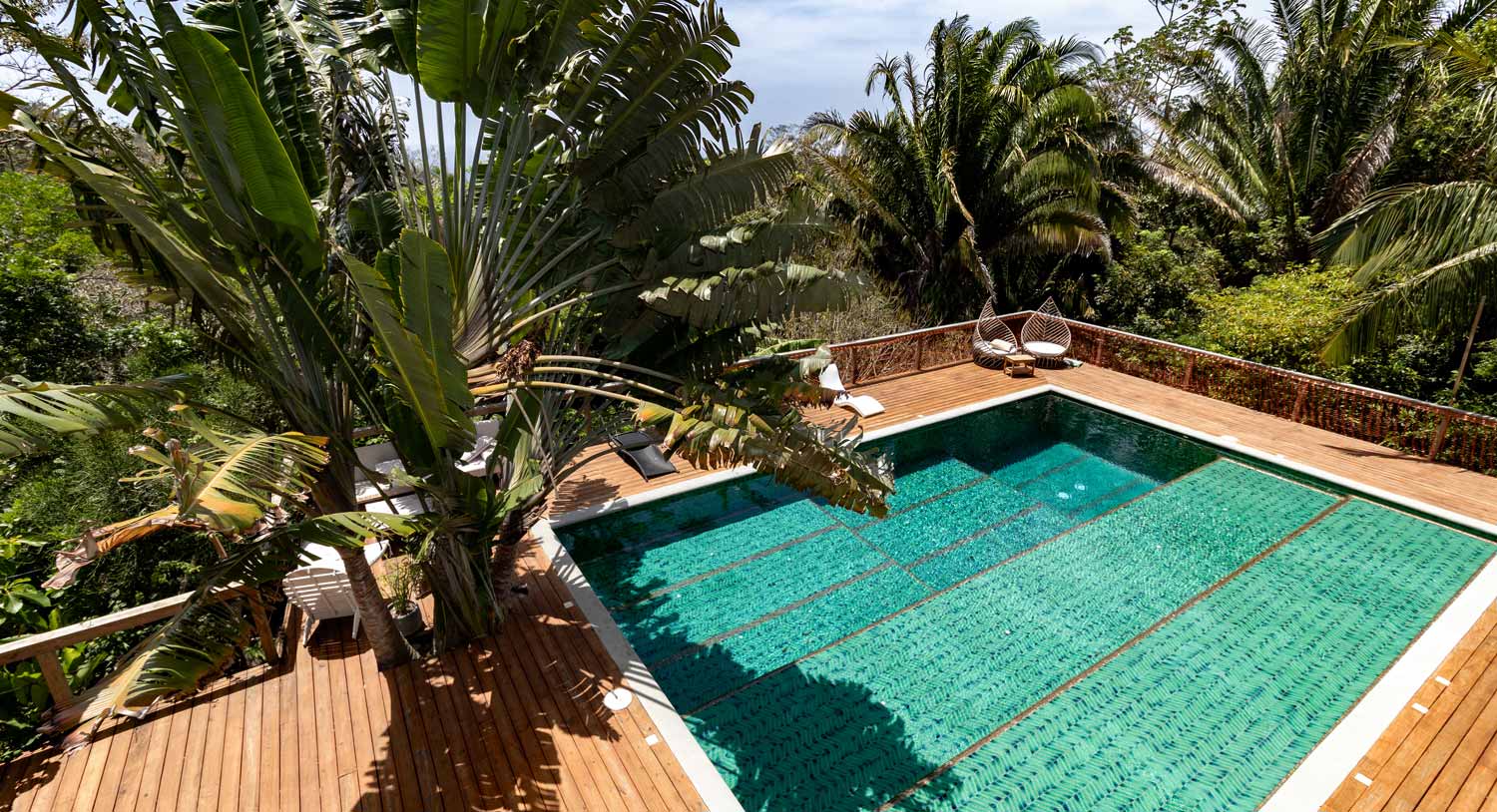 Our signature pool sits far above the sea in the morning sun in the jungle. Orchids, gladiolas, mangoes, papaya, and cocos grace the pool area where many of our friends and family commune.