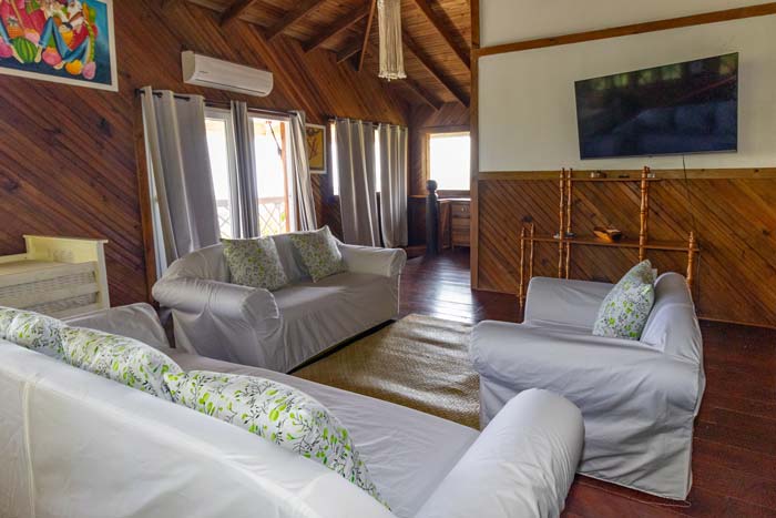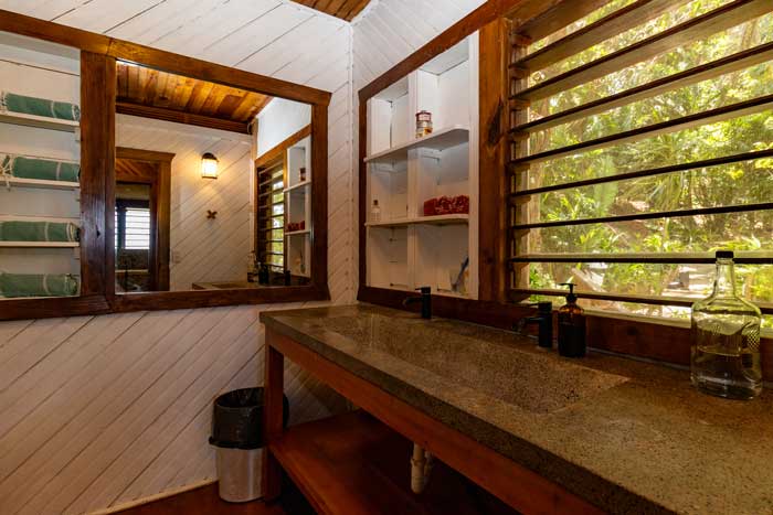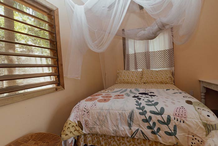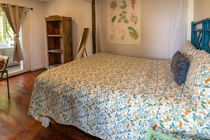 The lockoff suite with a queen bed, wifi, working space and private bathroom. Situated just off the large great area of the main house, it offers easy access to the first floor deck overlooking the sea and pool with lounging area, as well as easy-access to all the amenities of the main house and pool. A corner closet, dresser to stow away backpacks, suitcases and other items. Natural breezes and ceiling fans make this a comfortable space for most travelers, but for added comfort, add $15/night for air conditioning.